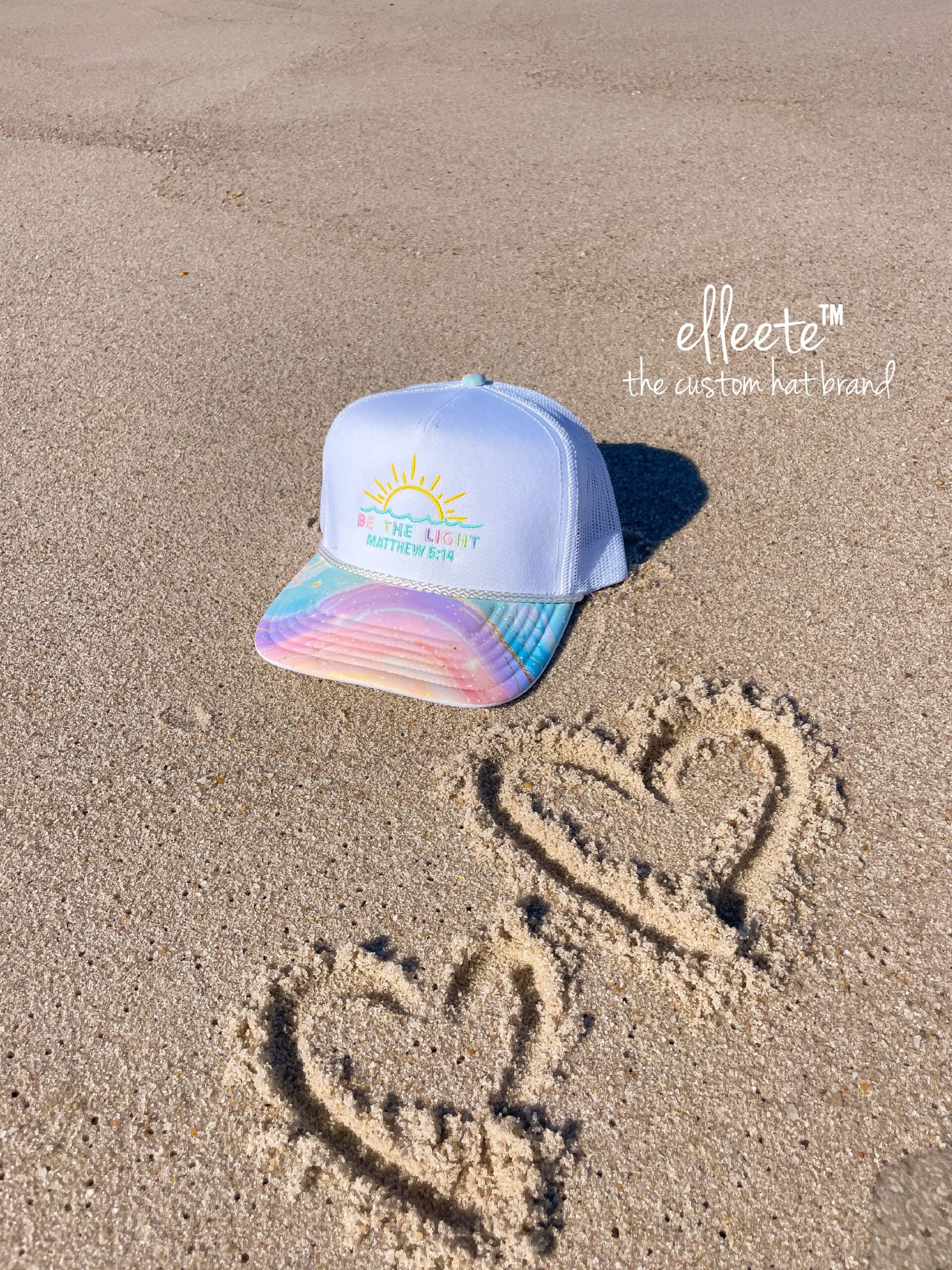 Pastel BE THE LIGHT Religious Trucker Hat comes in white with an Elleete™️ pastel galazy brim and embroidery as shown in photo