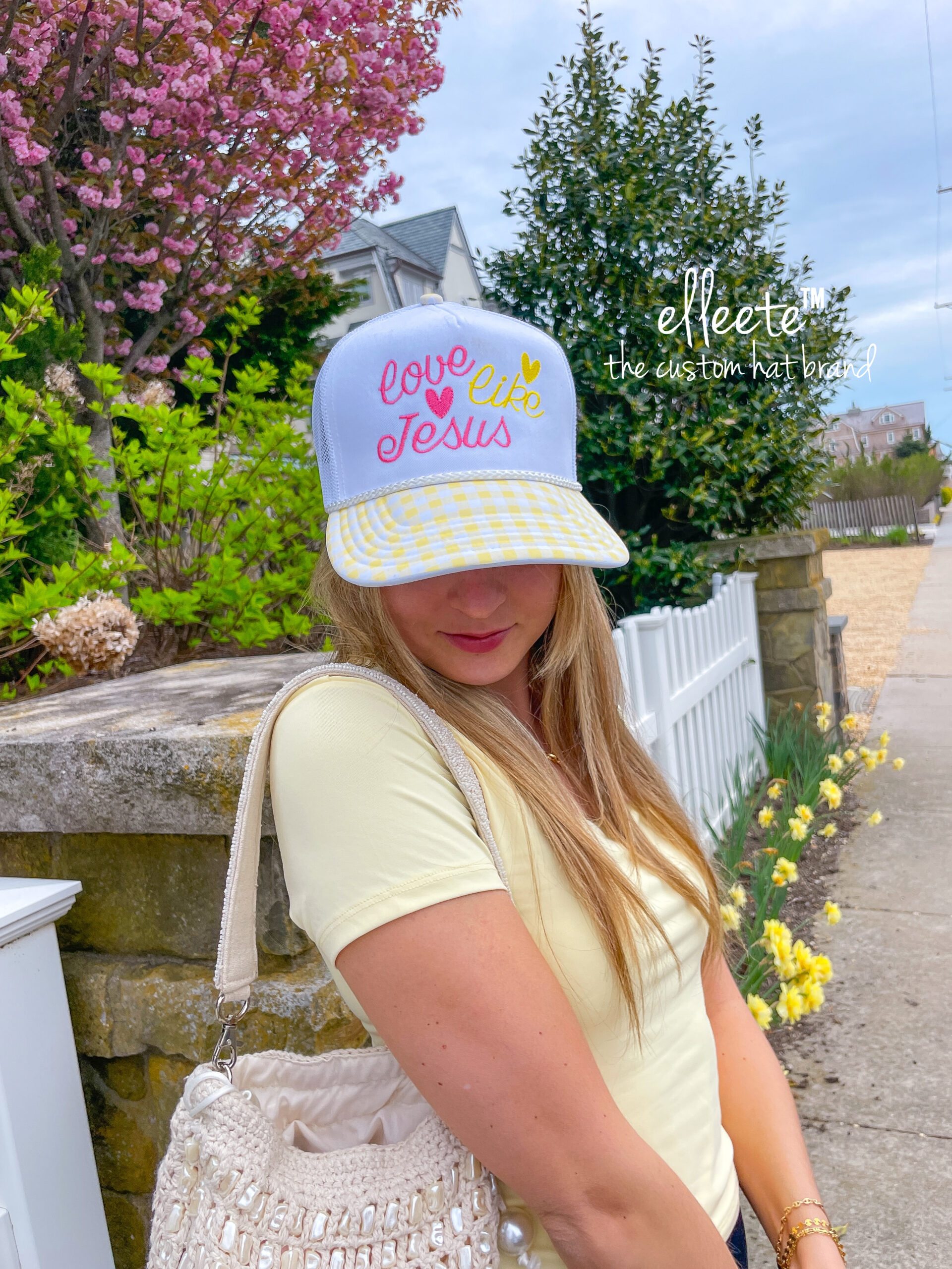 LOVE LIKE JESUS Religious Trucker Hat comes in white with an Elleete™️ yellow gingham brim and embroidery as shown in photo